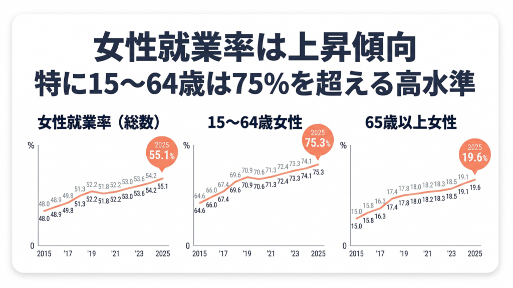 女性就業率が年々上昇し、30代・40代でも働き続けている流れは、公的統計でも確認できます。