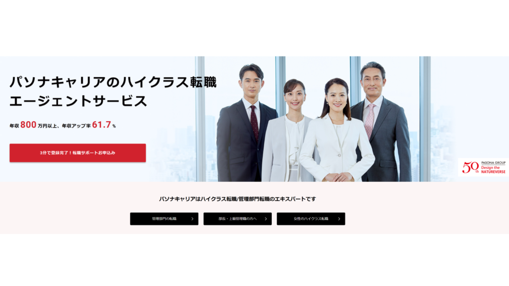 | 公式サイト | https://www.r-agent.com | https://doda.jp | https://mynavi-agent.jp | https://type.woman-agent.jp | https://www.pasonacareer.jp | https://www.bizreach.jp | https://smartcareer.b-stylejob.jp/ |