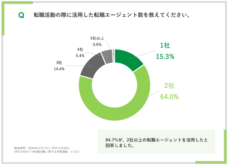 第二新卒エージェントneoが、20代の転職成功者111名を対象に実施したアンケート調査(2024年12月)では、転職活動で2社以上のエージェントを利用したと回答した人が全体の84.7%に上りました。