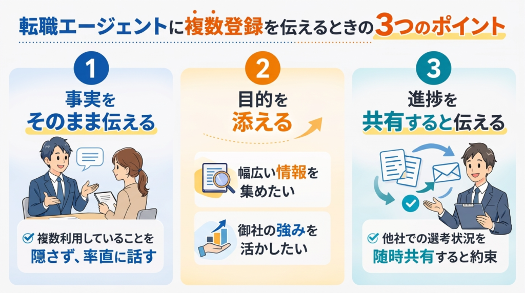 複数の転職エージェントを登録していることを伝えるとき、どう切り出せばよいか迷う方は多いです。