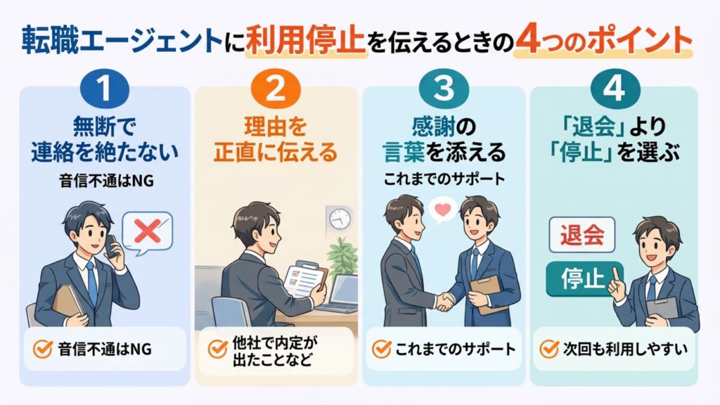 転職エージェントの利用を停止するときの4つポイントと例文