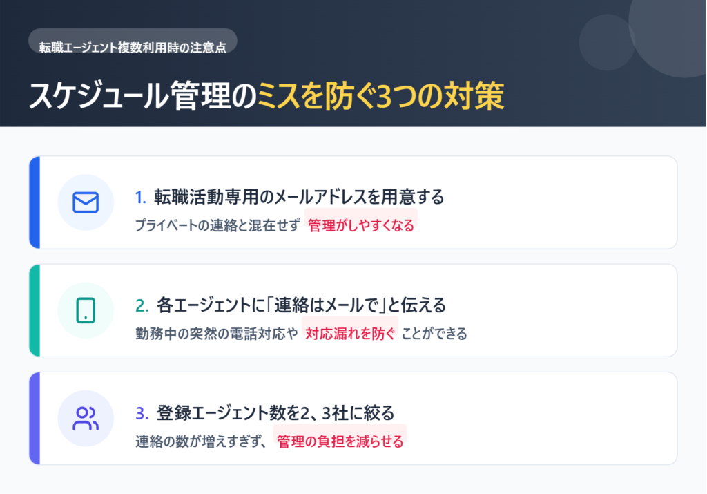一方で、二重応募やスケジュール管理の負担といったデメリットもあります。応募状況の一元管理と複数登録の事実をキャリアアドバイザーに正直に伝えることが重要です。